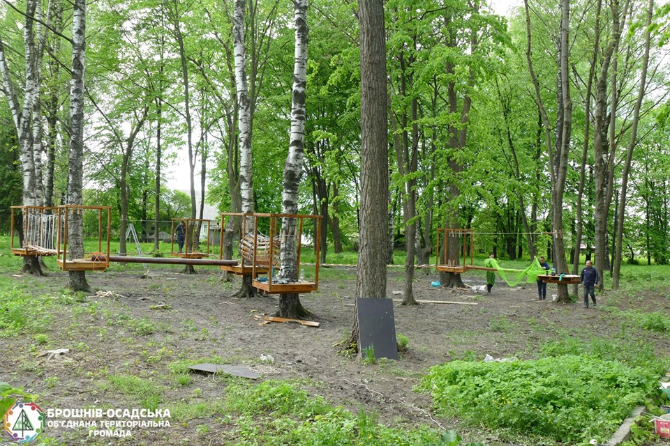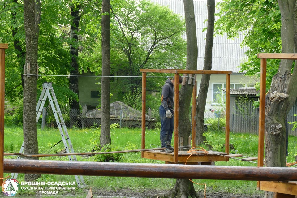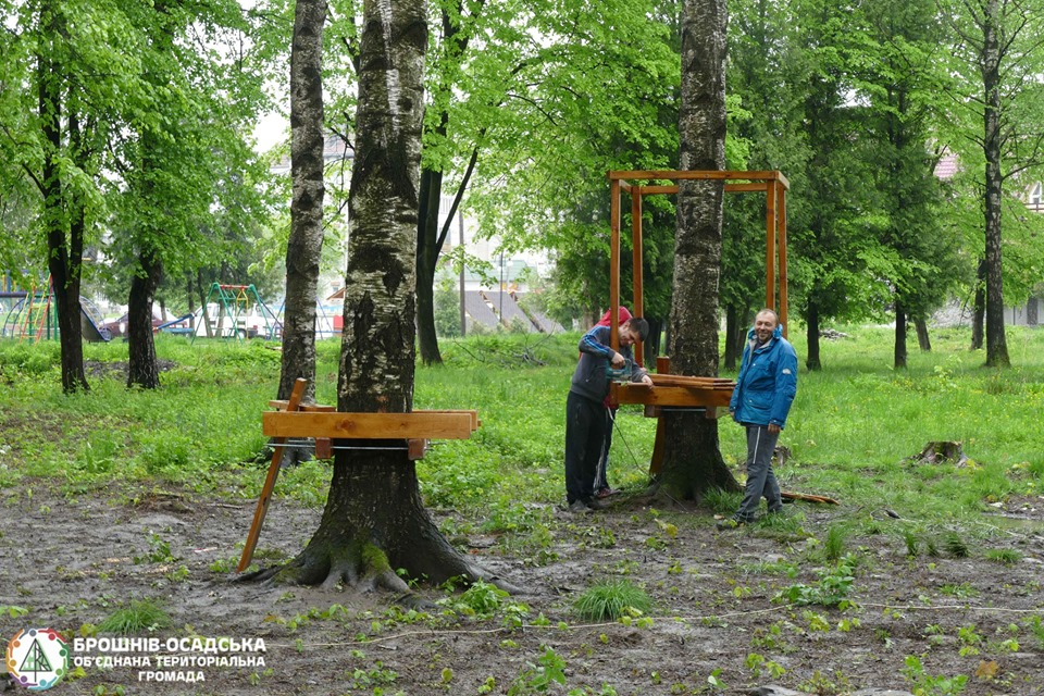 У парку біля Брошнів-Осадського Народного дому облаштовують цікаву і неординарну зону активного дозвілля для дітей - дитячий майданчик на базі мотузкового парку.