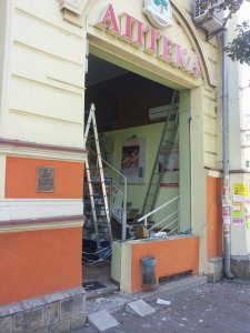В центрі Івано-Франківська на розі Чорновола-Січових Стрільців 8 вересня у пам’ятці архітектури місцевого значення без жодних дозволів власники аптеки міняють вікно.