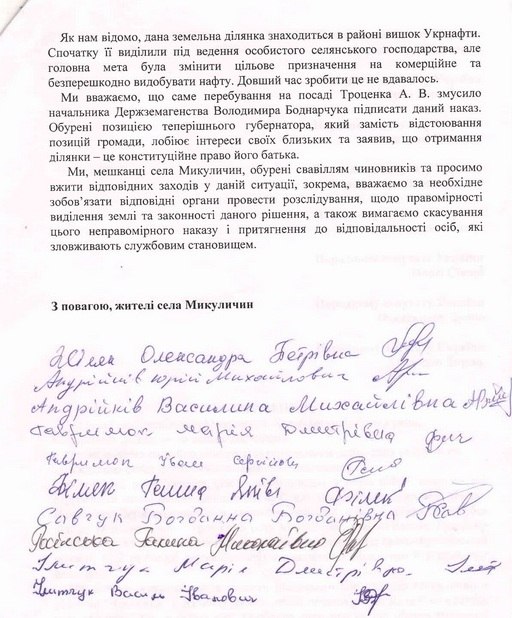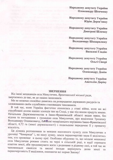 Мешканці села Микуличин звернулися до депутатів Верховної Ради України від Івано-Франківщини з проханням повернути селянам земельну ділянку в 0,72 га, яку, на їхню думку, в незаконний спосіб було передано батькові вже екс-губернатора Івано-Франківщини Андрія Троценка Володимиру Опанасовичу Троценку.
