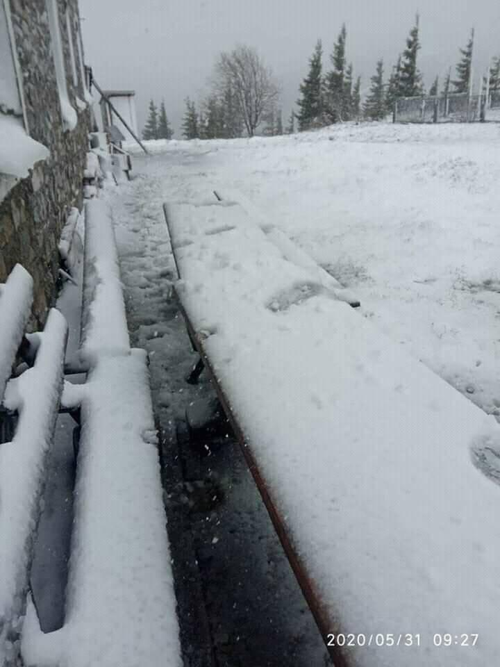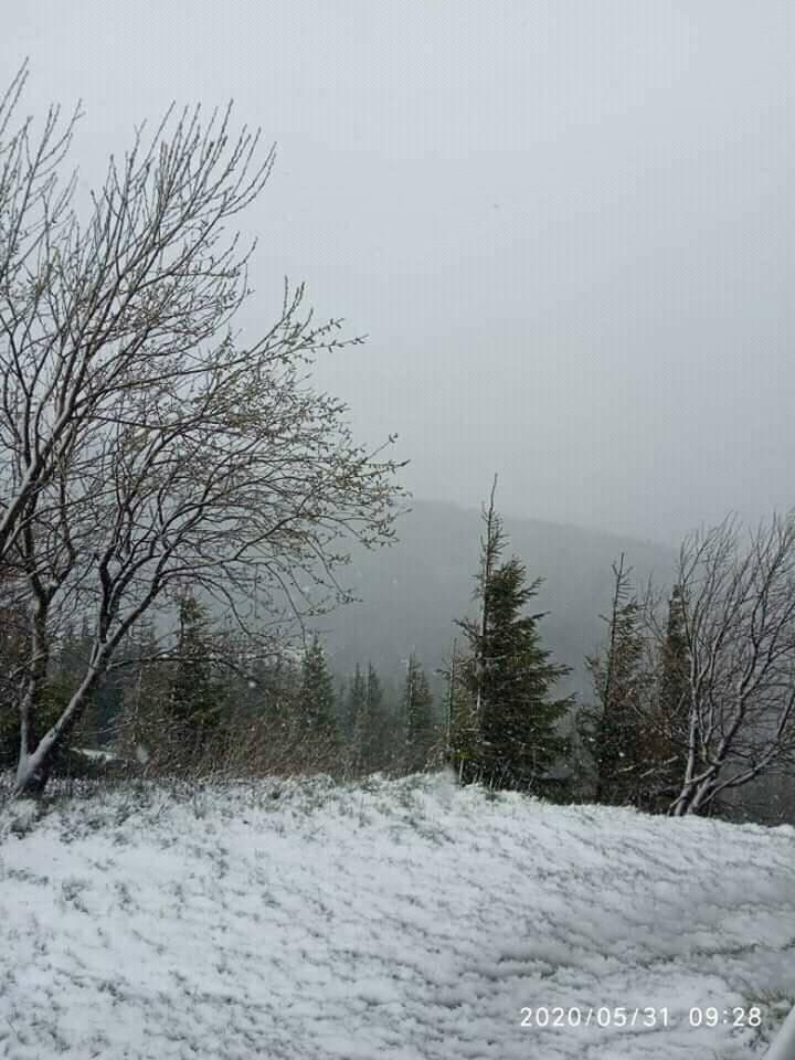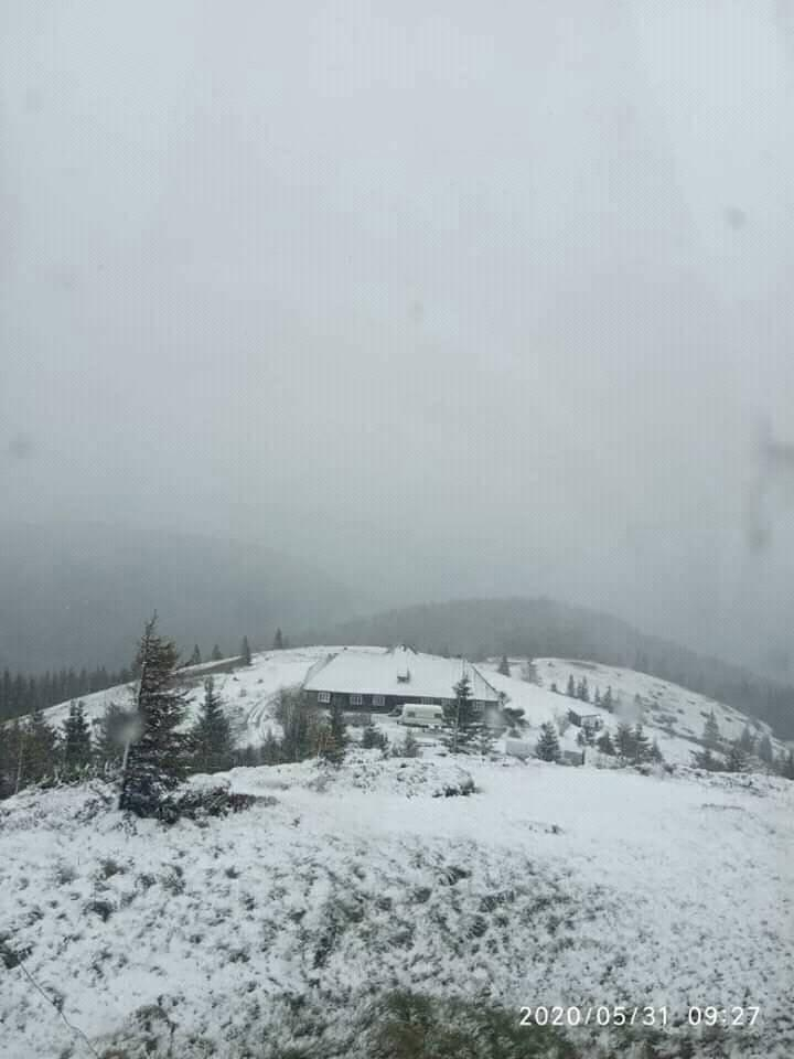 Станом на ранок 31 травня на горі Піп Іван Чорногірський хмарно, обмежена видимість до 20 м. Падає сніг.