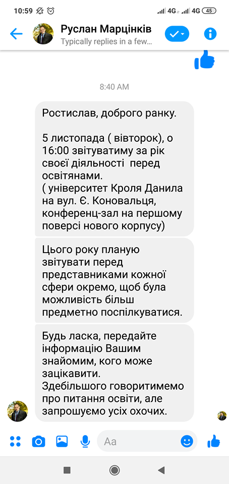 Повідомлення з таким змістом приходять зі сторінки Руслана Марцінківа у Фейсбуці.