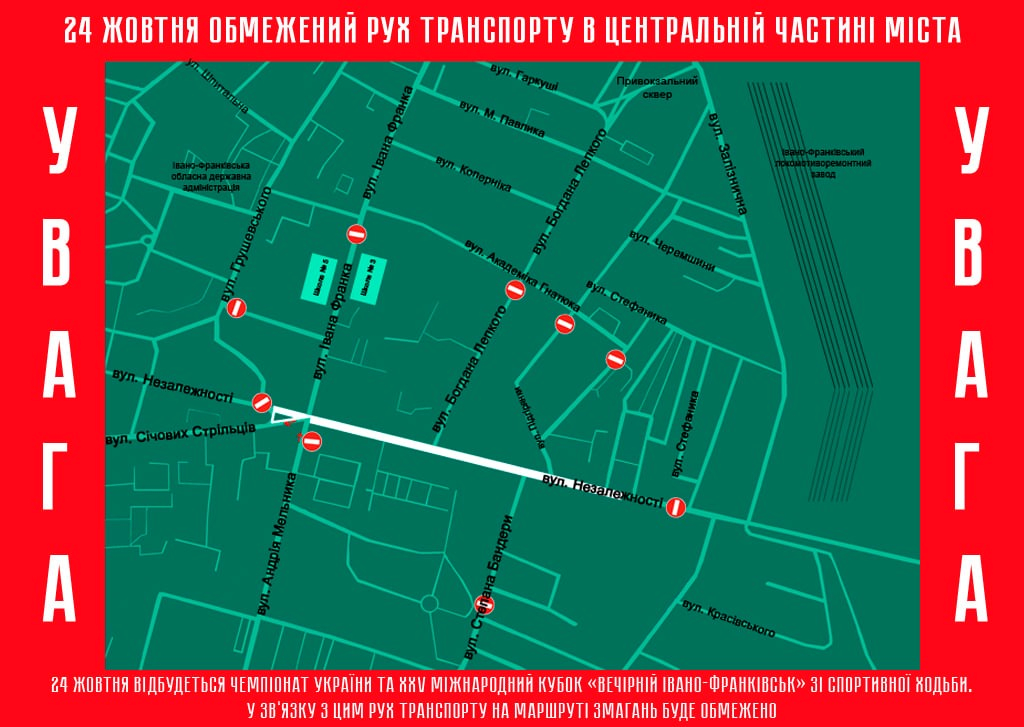 У зв’язку з цим, з 6.30 до 17.00 години планують обмежити рух транспорту на вулицях Незалежності, Богдана Лепкого, Івана Франка, Андрія Мельника, Степана Бандери та Марійки Підгірянки.