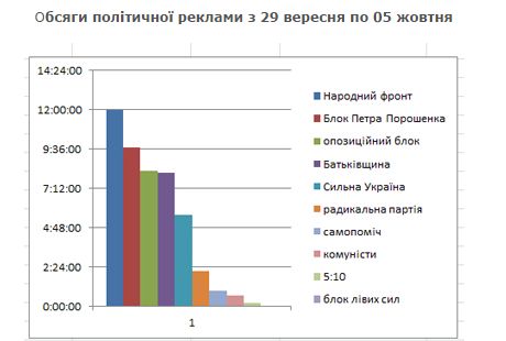 Загалом на загальнонаціональних телеканалах протягом тижня з 29 вересня по 5 жовтня кандидати в депутати розмістили 47годин 40 хвилин реклами.