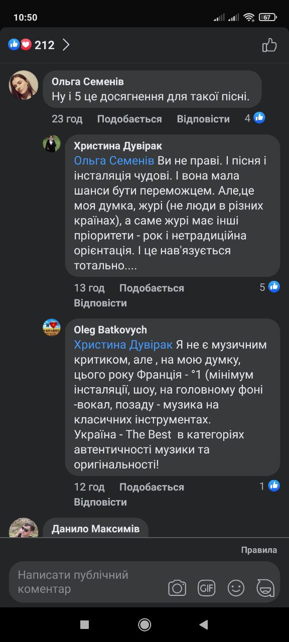 Христина Дувірак: Ольга Семенів Ви не праві. І пісня і інсталяція чудові. І вона мала шанси бути переможцем. Але, це моя думка, журі (не люди в різних країнах), а саме журі має інші пріоритети - рок і нетрадиційна орієнтація. І це нав'язується тотально....