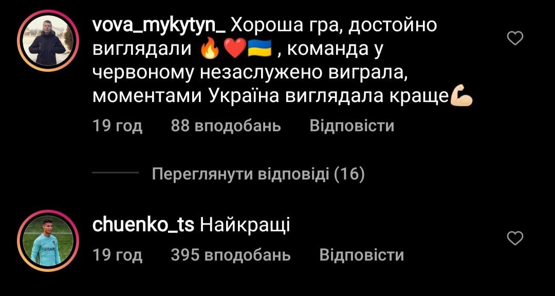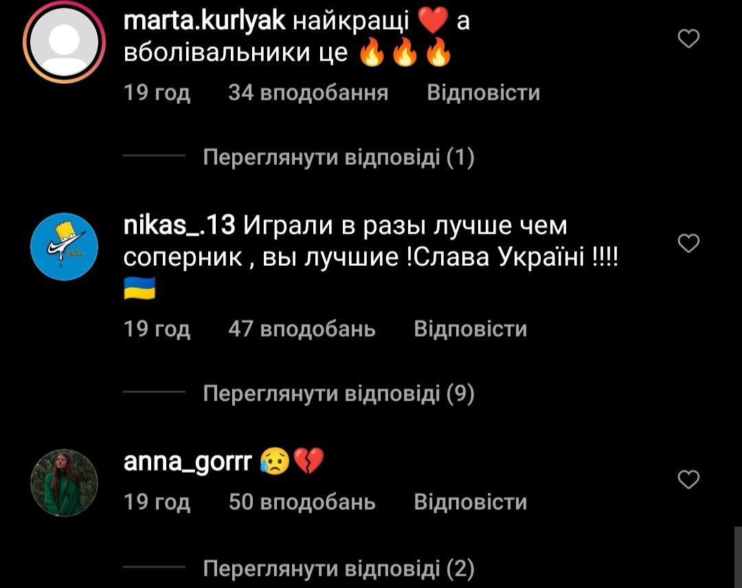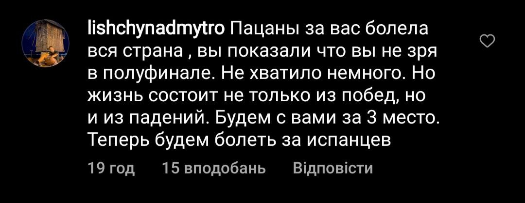 Думки щодо цього матчу розділилися. Хтось підтримує хлопців та дійсно розчарований цій поразці, а хтось винить самих гравців збірної та вважає, що якби не нереалізація моментів, то Україна вийшла до фіналу.