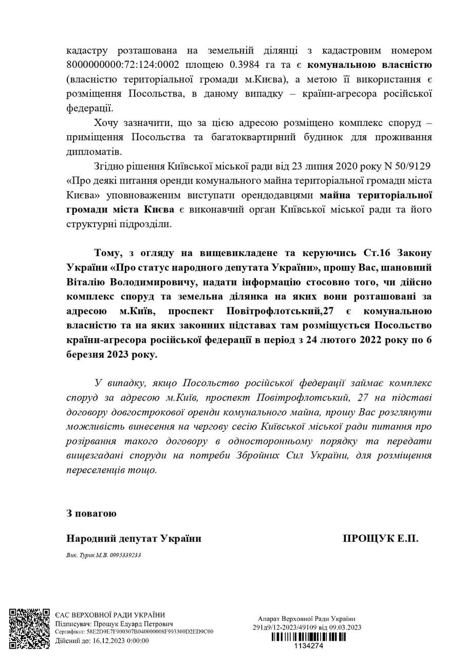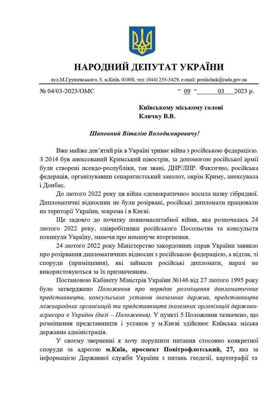 В березні народний депутат України Едуард Прощук звернувся з офіційним зверненням до Віталія Кличка щодо можливості розірвання в односторонньому порядку договору оренди земельної ділянки за адресою м.Київ, проспект Повітрофлотський, 27.