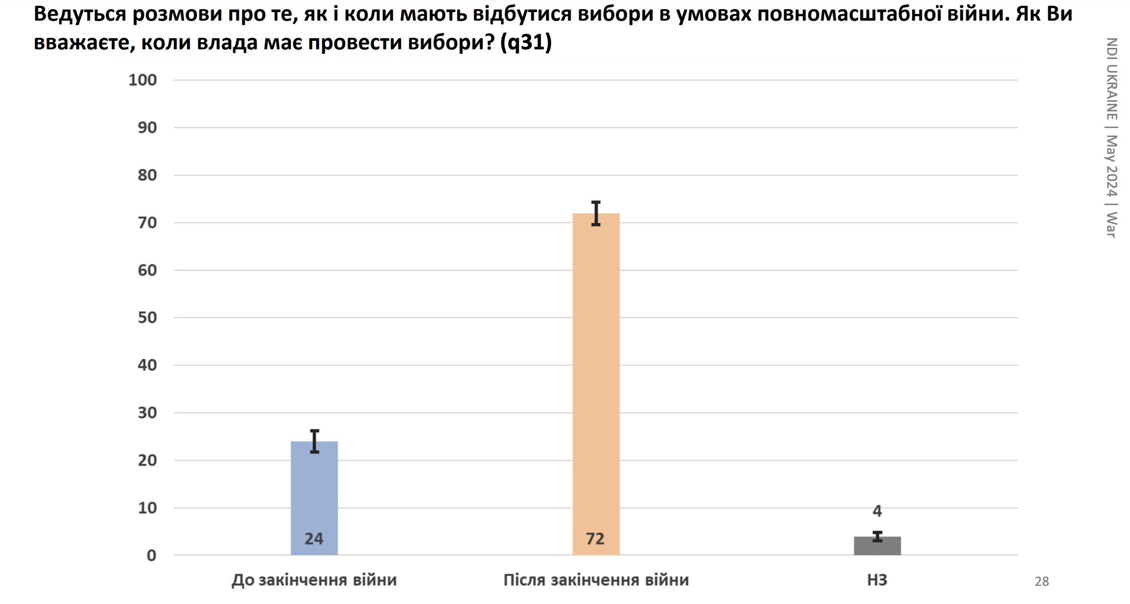 Водночас 24% опитаних вважають, що вибори необхідно провести до закінчення війни. Ще 4% не змогли відповісти.