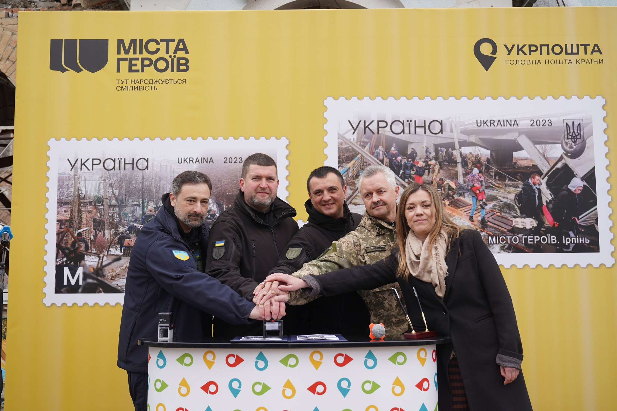 У заході, що пройшов зранку в Ірпені, взяли участь генеральний директор Укрпошти Ігор Смілянський, міський голова Ірпеня Маркушин Олександр, голова Бучанської районної військової адміністрації Данило Мавлянов, очільник Гостомельської селищної військової адміністрації Сергій Борисюк та Писарчик Анна, мешканка Ірпеня, зображена на одному з фото поштового блоку.