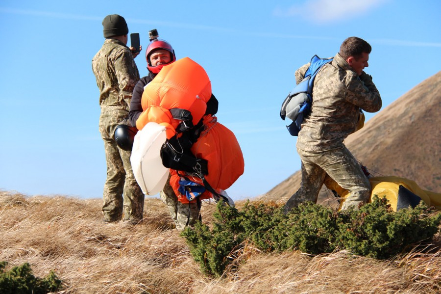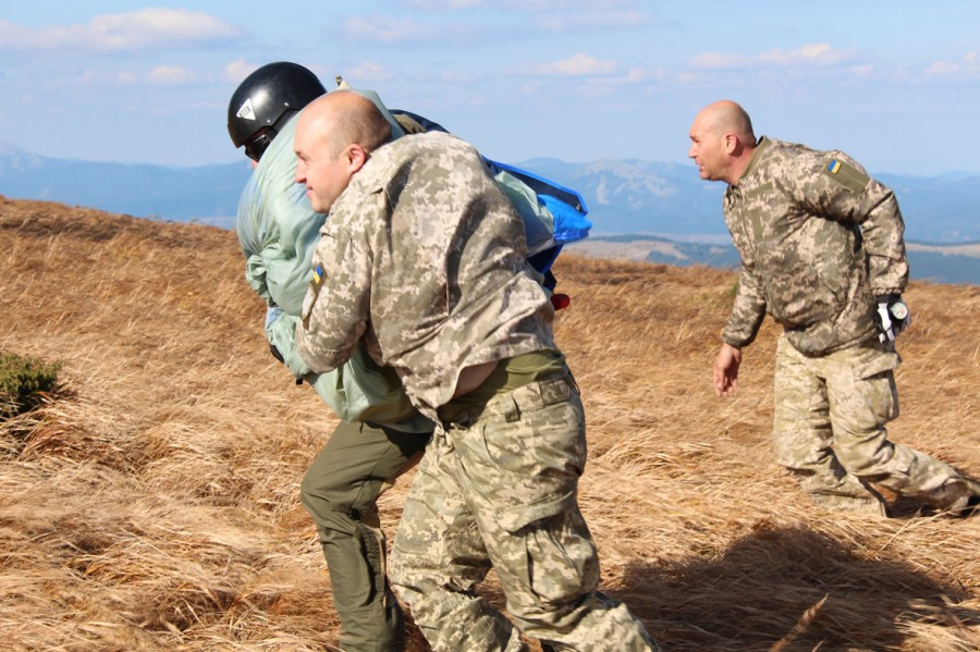 Причому на горі їх ніхто не зустрічав. Тобто, як кажуть парашутисти, майданчик приземлення був непідготовлений. Усе відбувалося так, немов рятувальники здійснюють справжню операцію із порятунку і стрибають туди, звідки надійшов тривожний сигнал. Що називається наосліп. Після стрибка парашутистів над горою завис і гелікоптер. Кількахвилинне приземлення на вершині, умовна евакуація потерпілого, і знову — в небо…