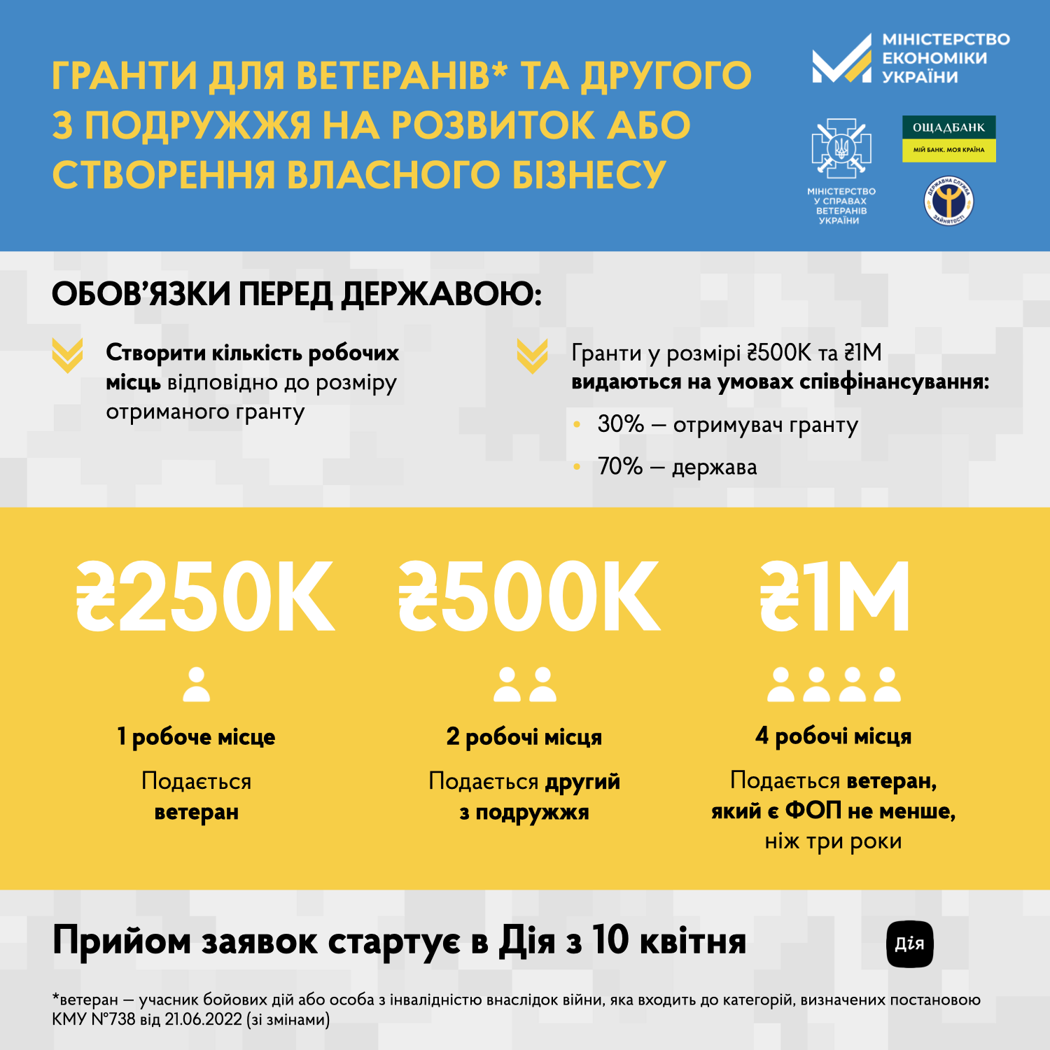 “З 10 квітня Уряд запускає нові грантові програми для ветеранів, завдяки яким вони зможуть отримати фінансову підтримку від держави для старту або розвитку своєї справи. Наші захисники і захисниці, які мають бажання займатися підприємництвом, або ж розвивати свій бізнес після повернення до цивільного життя, зможуть отримати грант від 250 тис грн до 1 млн грн.Окрім того, другий з подружжя захисника зможе отримати грант 500 тис грн на розвиток сімейного бізнесу. Зазначу, що обов'язковою умовою надання грантів є створення нових робочих місць, і ми розраховуємо, що ветерани-підприємці залучатимуть до свого бізнесу насамперед своїх побратимів. Таким чином допомагаючи їм якнайшвидше інтегруватись в мирне життя та отримати економічну незалежність”, - зазначила Перший віцепрем'єр-міністр України - Міністр економіки Юлія Свириденко.