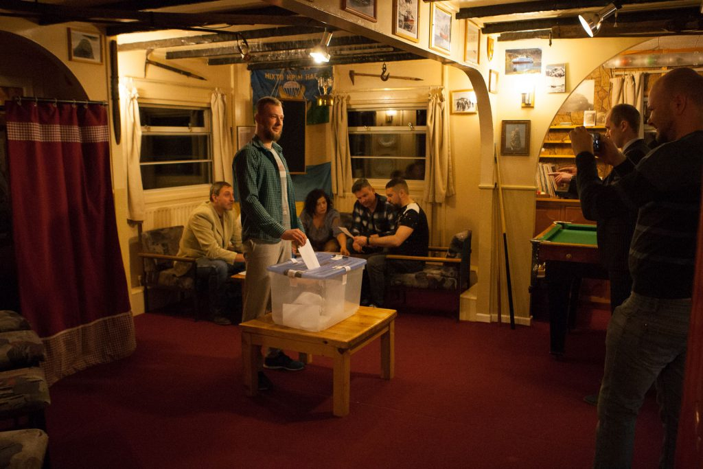 Голосували станційники у приміщенні бару "Фарадей", а замість скриньки для голосування був прозорий бокс для їжі.