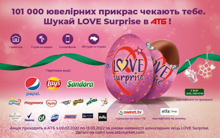 Із сьогоднішнього дня, 2 лютого, і по 13 березня 2022 року в 1316 супермаркетах роздрібної мережі «АТБ Маркет» у всіх 24 областях країни, а також в інтернет-магазині «АТБ» стартує найромантичніша акція року. На прилавках з'являться шоколадні яйця LOVE Surprise. Цей унікальний продукт був спеціально створений для спільної з агентством маркетингових сервісів Twiga`Go акції до Дня всіх закоханих. Під шаром смачного шоколаду ховається безліч неймовірних подарунків.