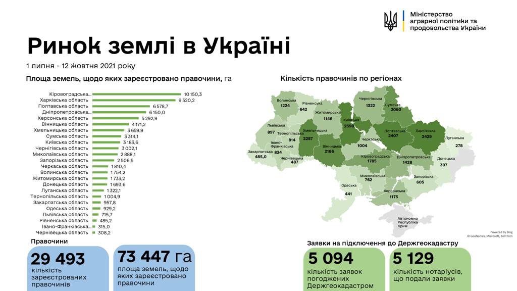 Станом на 14 жовтня вже уклали 29 493 угоди. Зокрема, від початку липня вже подали 5 759 заяв для отримання доступу до Державного земельного кадастру. З них погодили – 5 094, розглядають – 3, відмовили – 662, передає Фіртка.