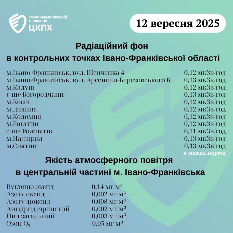 Станом на ранок 12 вересня показники радіаційного фону в Івано-Франківській області становлять від 0,11 мкЗв/год до 0,13 мкЗв/год.