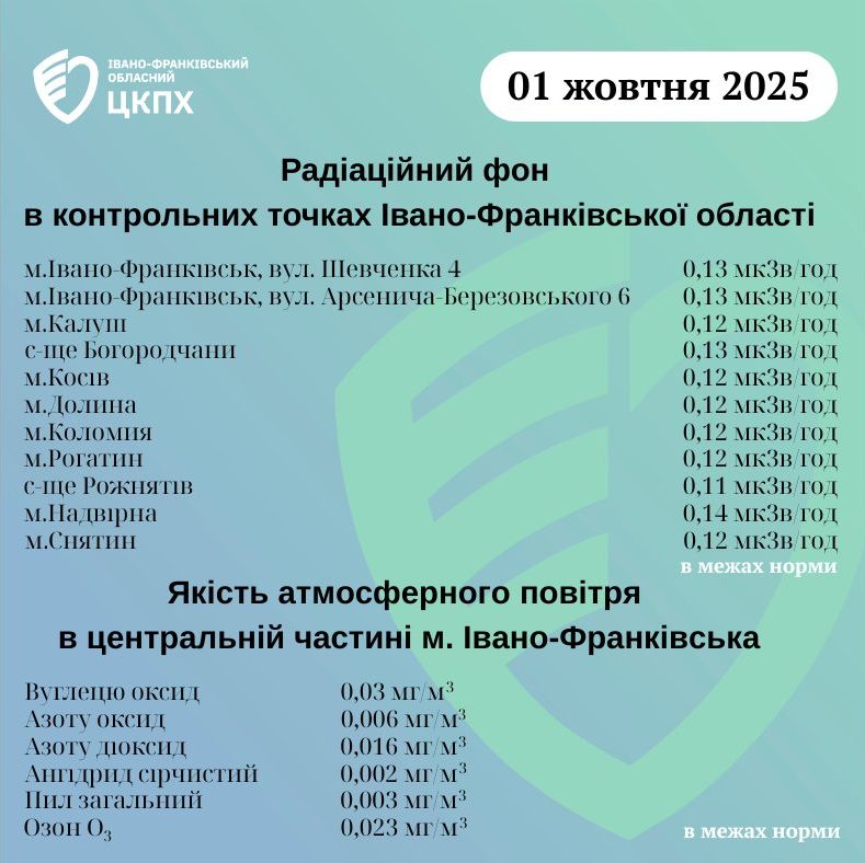Станом на ранок першого жовтня показники радіаційного фону в Івано-Франківській області становлять від 0,11 мкЗв/год до 0,14 мкЗв/год.