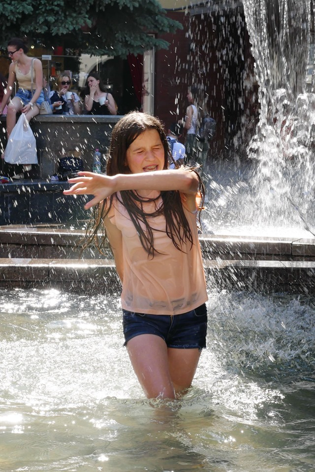 А от дітвора знайшла оригінальніший спосіб - купання у фонтані на Вічевому майдані. Діти стають під струмені води та бігають там босоніж. Старші дівчатка сидять у затінку і підставляють ноги під бризки фонтану.