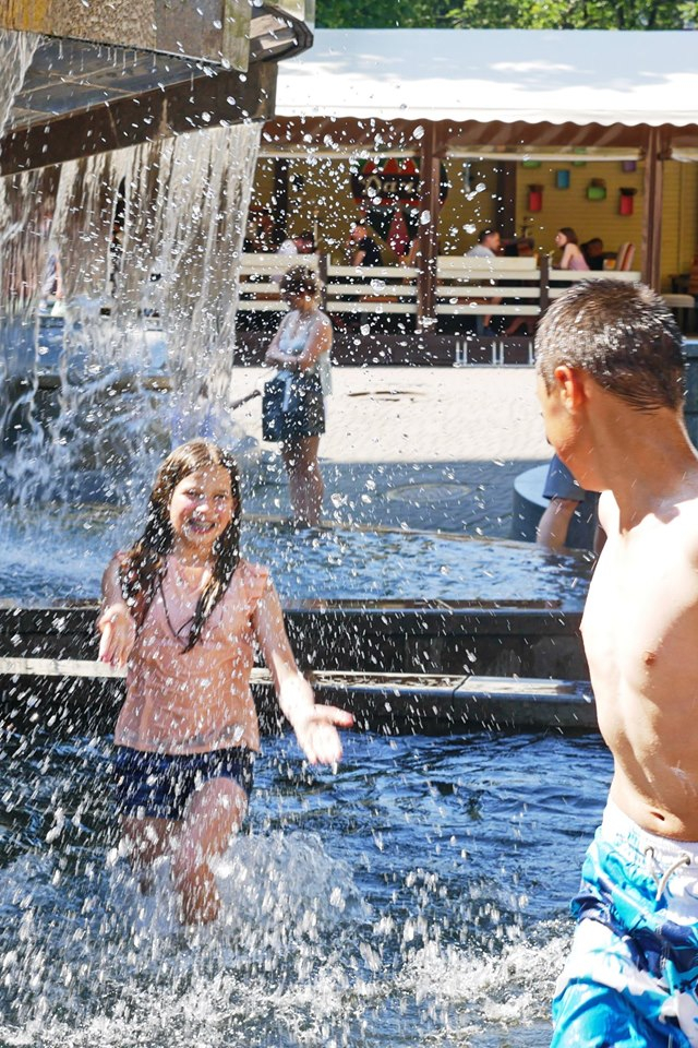 Поки дітлахи купаються у фонтані, на них ніхто не зважає. Дорослі відпочивають на лавочках.