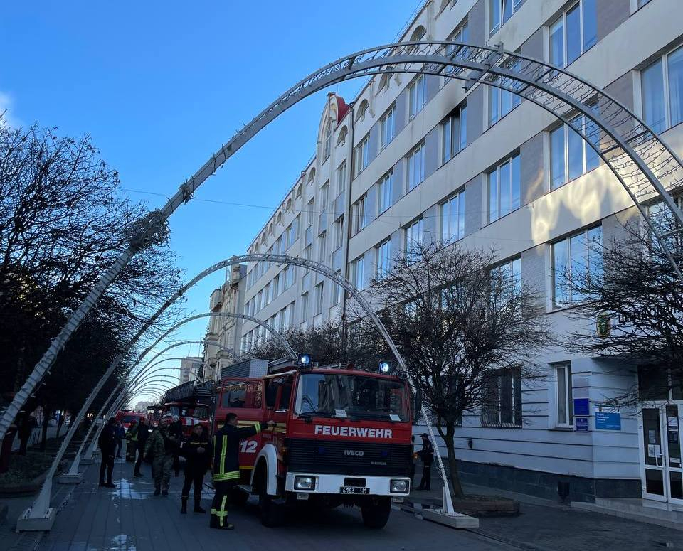 Як зазначається, займання сталося в одному з приміщень на четвертому поверсі будівлі. Для гасіння пожежі прибули сім пожежних автомобілів, в тому числі автодрабина.