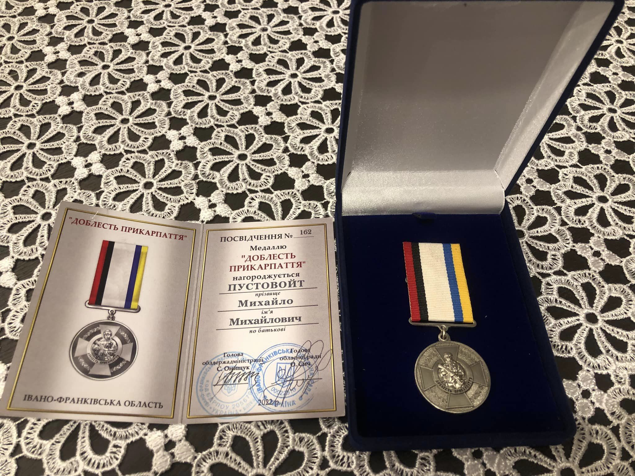 Відтак, завідувач кафедри психіатрії, наркології та медичної психології отримав офіційну відзнаку – медаль «Доблесть Прикарпаття». Додамо, що таку відзнаку вручають «за жертовність та зусилля, проявлені у волонтерській діяльності, організації та наданні матеріальної, фінансової та іншої допомоги ЗСУ, іншим військовим формуванням України для відсічі збройної агресії російської федерації, спрямованої проти суверенітету і територіальної цілісності України».