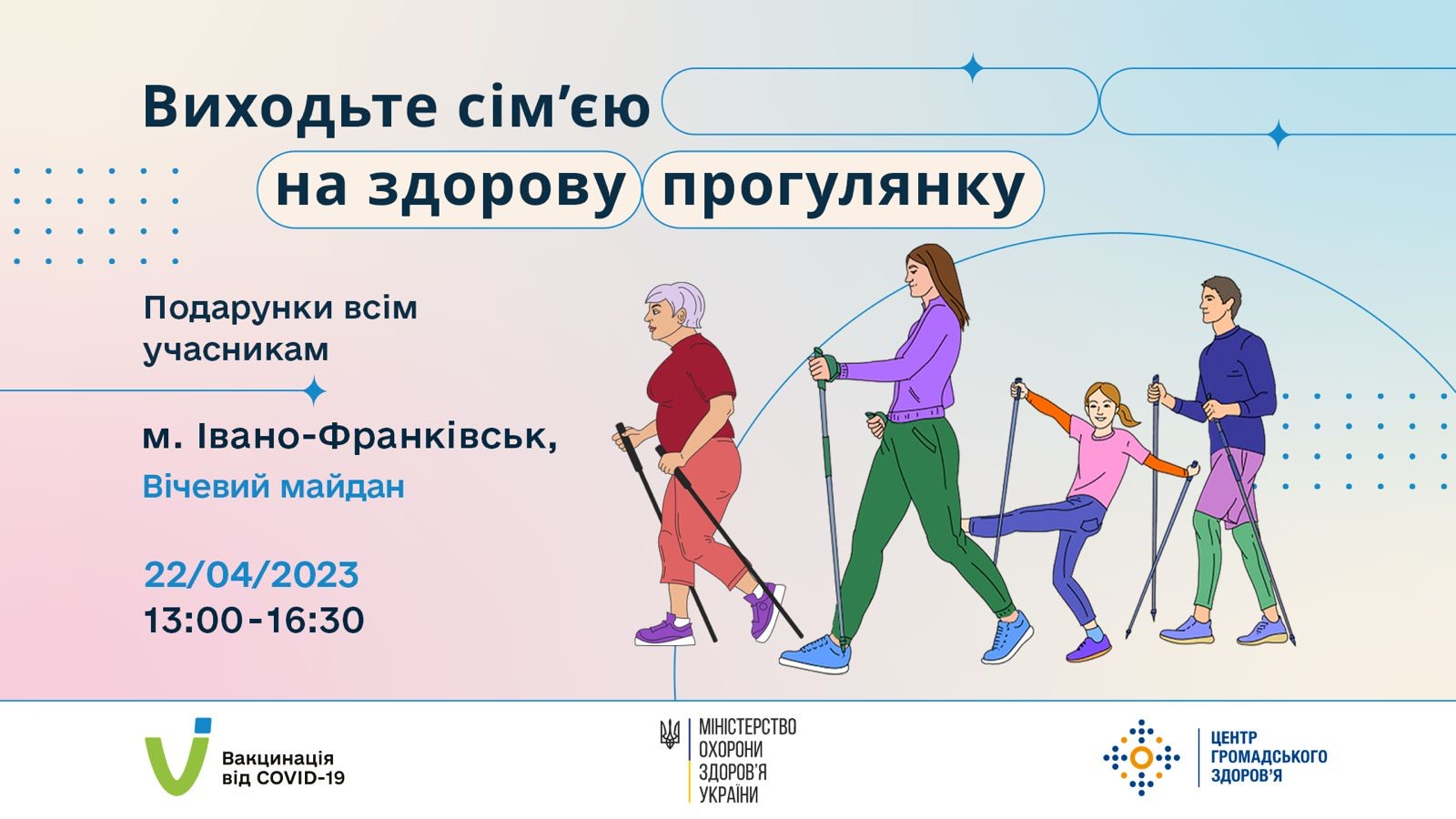 У суботу, 22 квітня, мешканців Івано-Франківська запрошують долучитись до «Здорової прогулянки» біля Вічевого майдану, під час якої всі охочі разом з інструктором зможуть навчитися скандинавській ходьбі й перевірити свій стан здоров’я.