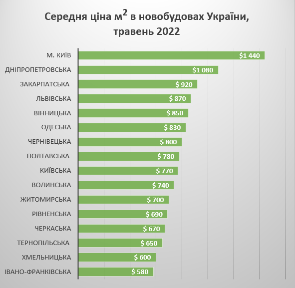 З початку війни спостерігався підвищений попит на житло у безпечних областях: Івано-Франківська, Тернопільська, Львівська, Чернівецька. Тому фахівці одразу прогнозували у них пропорційний ріст цін на квартири. Тенденція росту запитів щодо новобудов спостерігається й досі, проте, як видно з даних ЛУН, таке житло є найбільш доступним саме у регіонах підвищеного попиту. Так, за новеньку квартиру у сучасному житловому комплексі Івано-Франківська потрібно заплатити в середньому 580 дол./кв. м. Майже так само коштує житло у будівельних компаніях Тернопільщини (650 дол./кв. м) та Хмельниччини (600 дол./кв. м). А вже у Львівській області новобудова обійдеться на 35-50% дорожче, сягаючи в середньому 870 дол./кв. м.