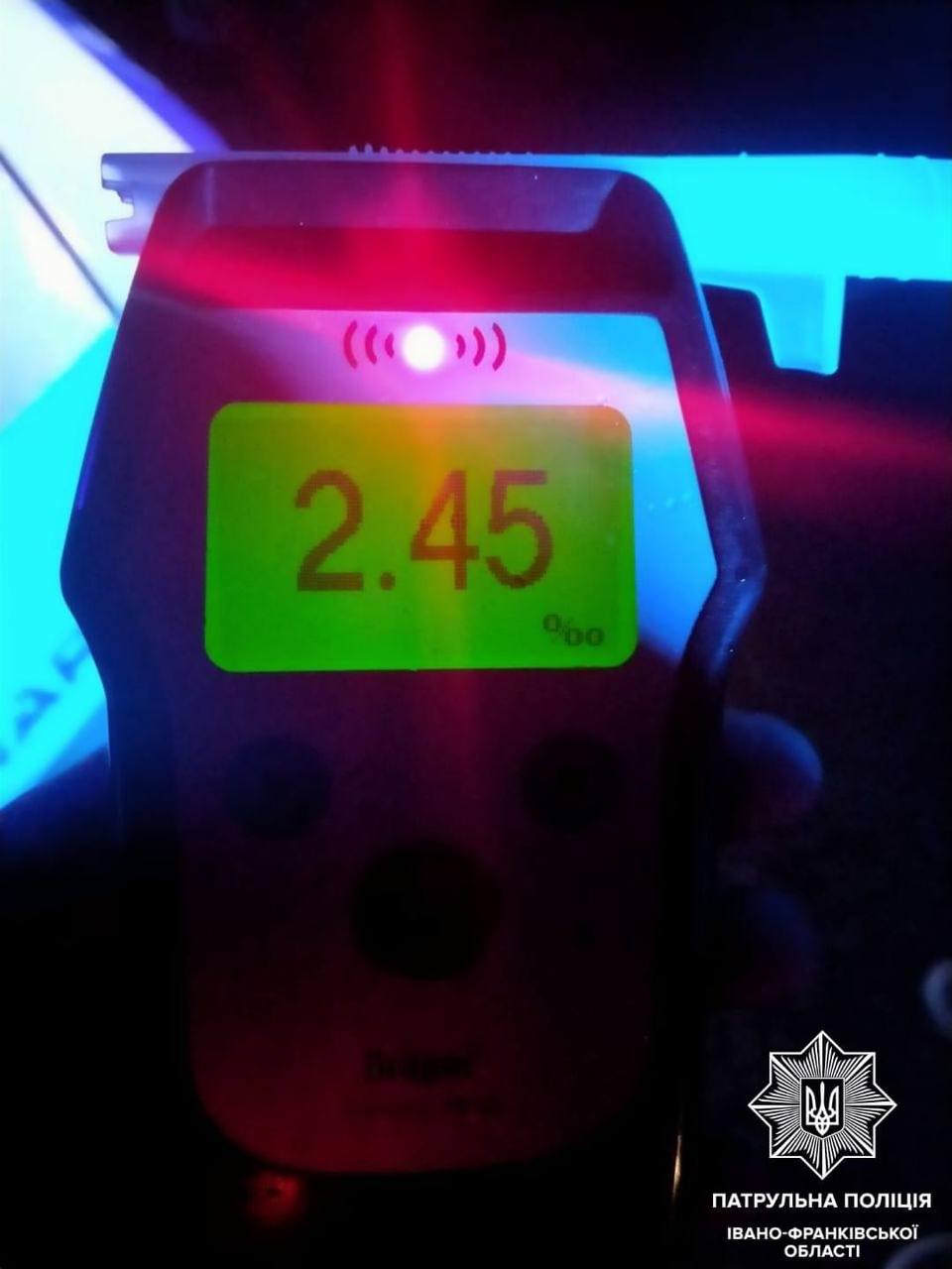 Під час спілкування з водієм, патрульні виявили у 25-річного керманича ознаки сп’яніння. Чоловік погодився пройти освідування на місці. Результат огляду — 2.45 проміле алкоголю в крові.