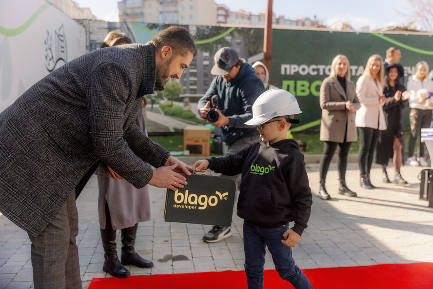 Урочисту частину свята розпочав маленький посланець від blago developer, якого ефектно привезли на автомобілі Tesla. Хлопчик вручив представникам компанії валізу з ключами. А далі під теплі слова привітань та гучні оплески відбувалося почесного вручення ключів власникам квартир.