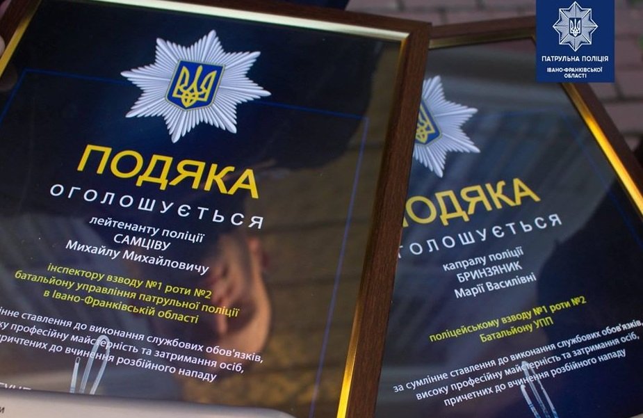 Так відзнаки за затримання осіб отримали: поліцейський взводу №2 роти №2 батальйону УПП в Івано-Франківській області ДПП капрал поліції Бринзяник Марія та інспектор взводу №1 роти №2 батальйону УПП в Івано-Франківській області ДПП лейтенант поліції Семців Михайло, інформує Фіртка.