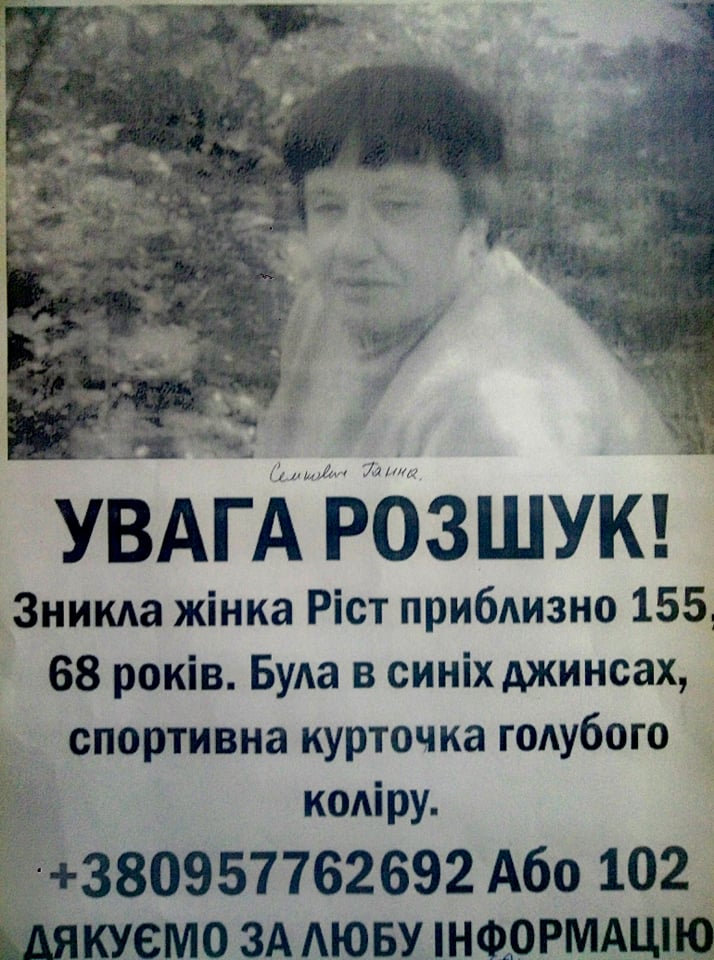 Була вдягнена у сині джинси та куртку блакитного кольору. Ріст близько 155 сантиметрів. Можливо, у жінки проблеми з пам'яттю.