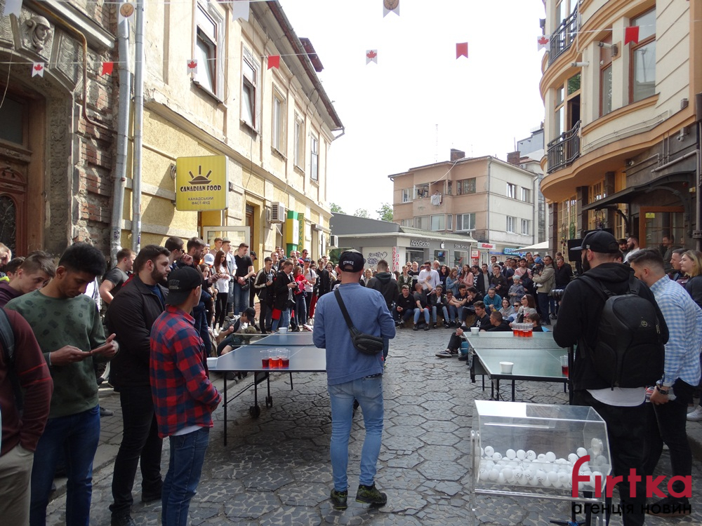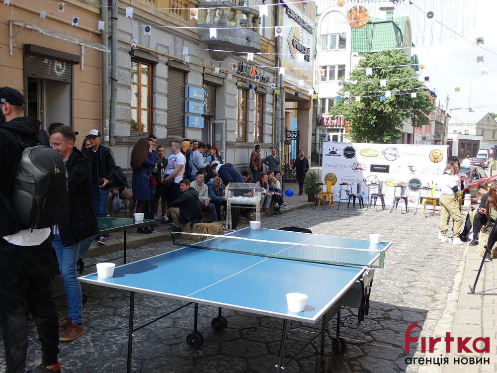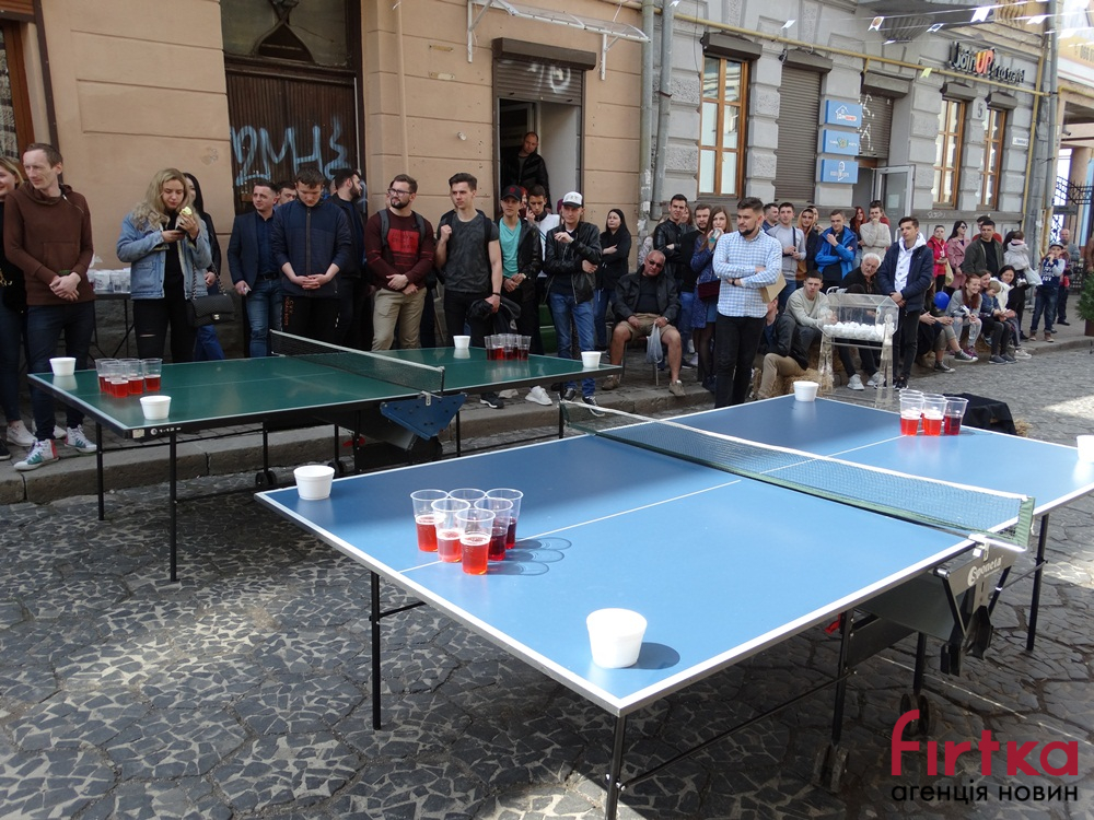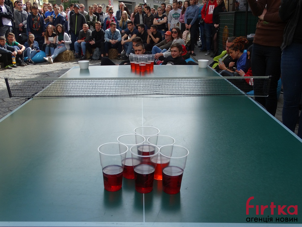 Крім поїдання корн-догів, також відбувся чемпіонат із сидр-понгу. Це гра, в якій треба потрапити м’ячиком у стакан команди-суперниці.