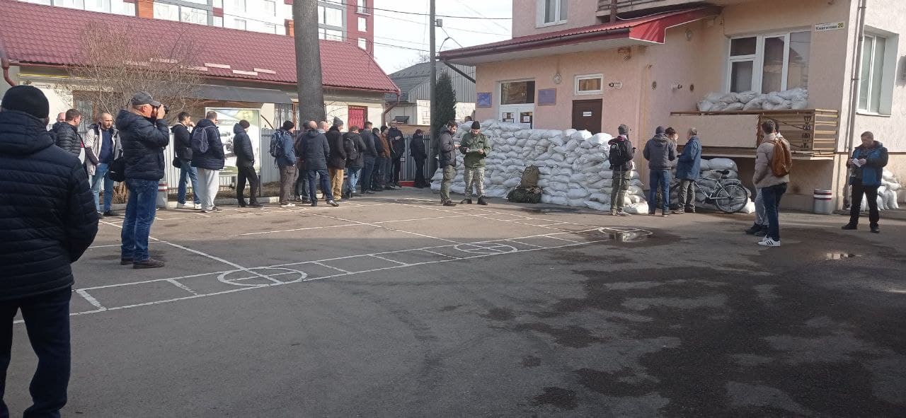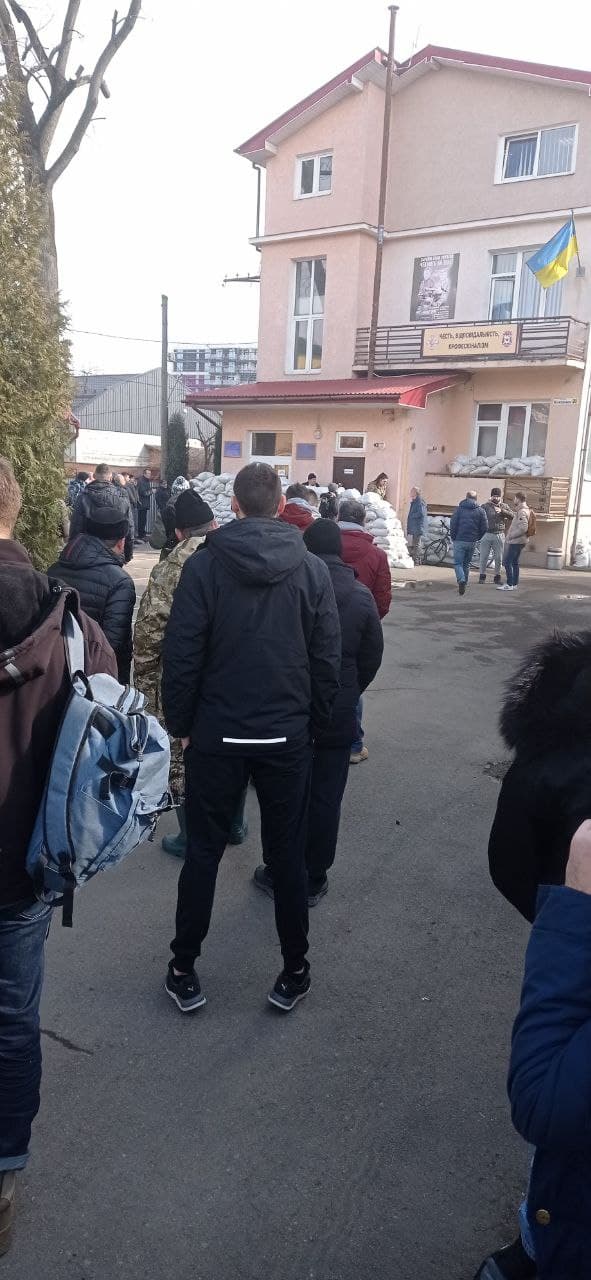Тим часом черга охочих вступити до підрозділів територіальної оборони під Івано-Франківським міським ТЦК та СП розтягнулася на кілька десятків метрів.