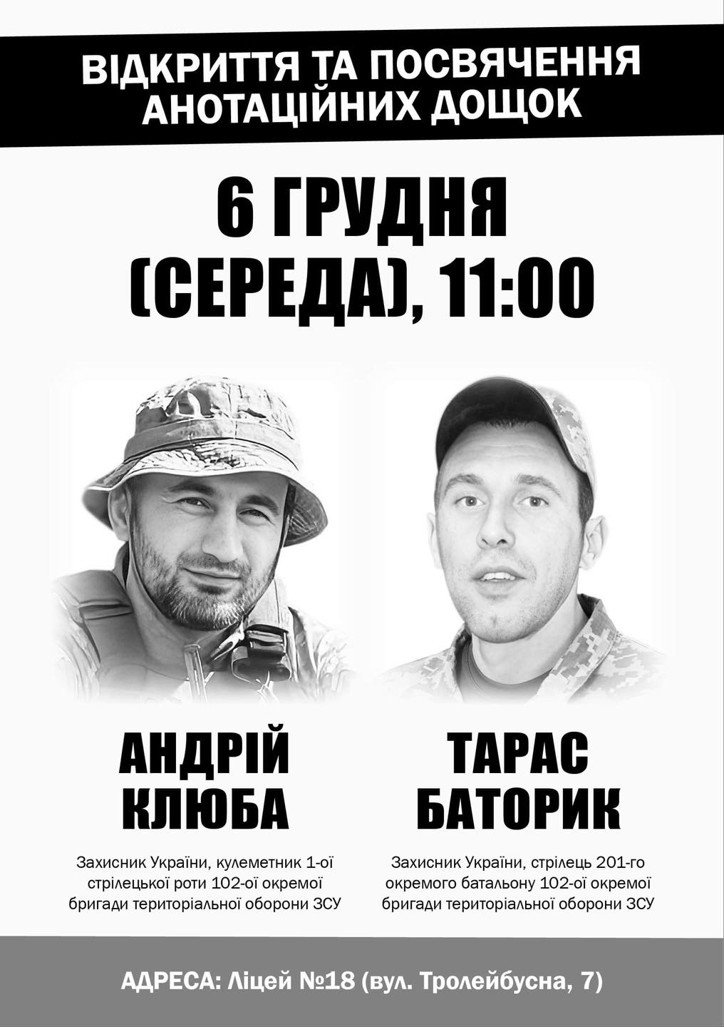 У середу, 6 грудня, об 11:00 відбудеться відкриття анотаційних дощок полеглим Героям Андрію Клюбі та Тарасу Баторику.