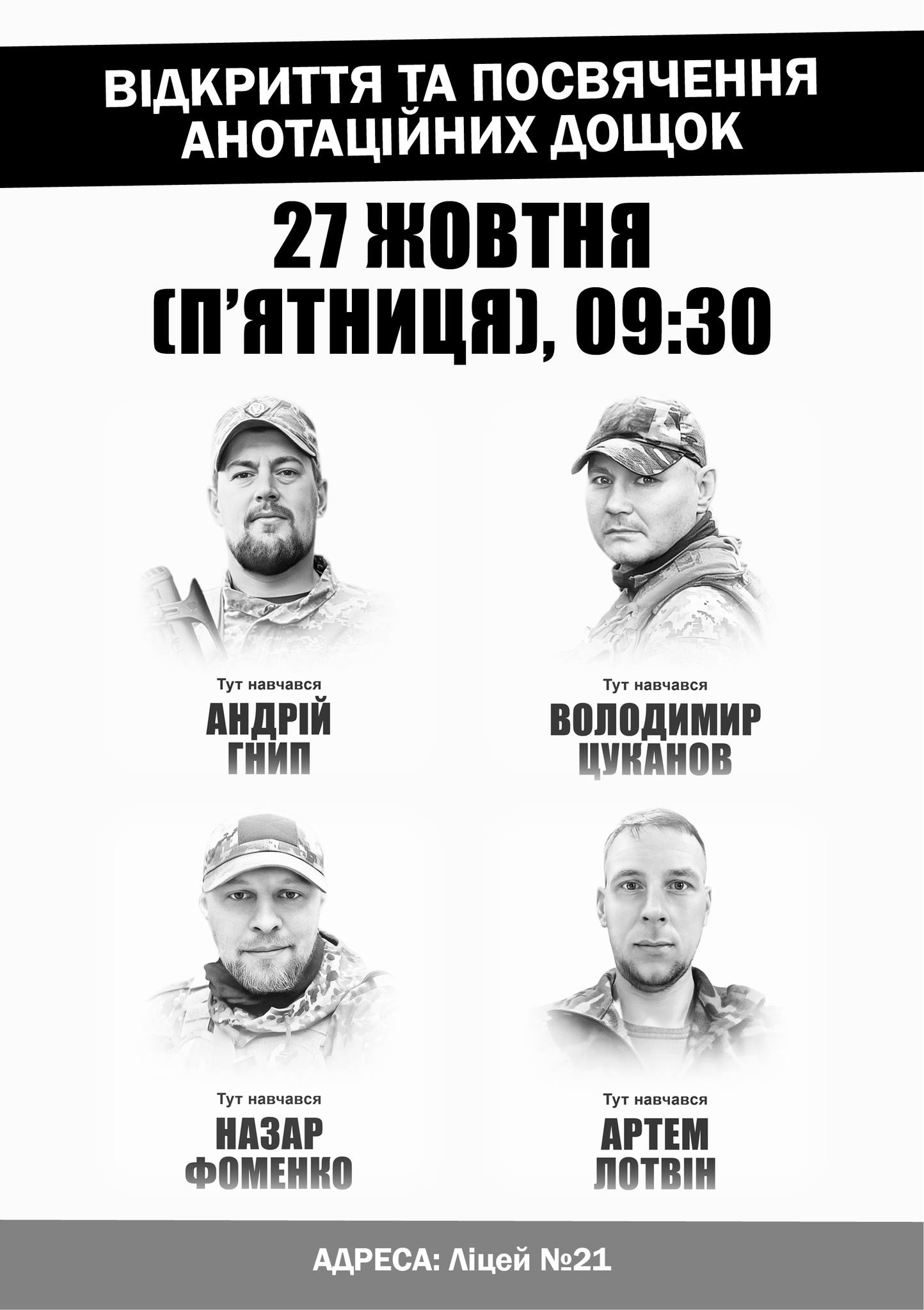 У п’ятницю, 27 жовтня, відкриють анотаційні дошки чотирьом полеглим бійцям.