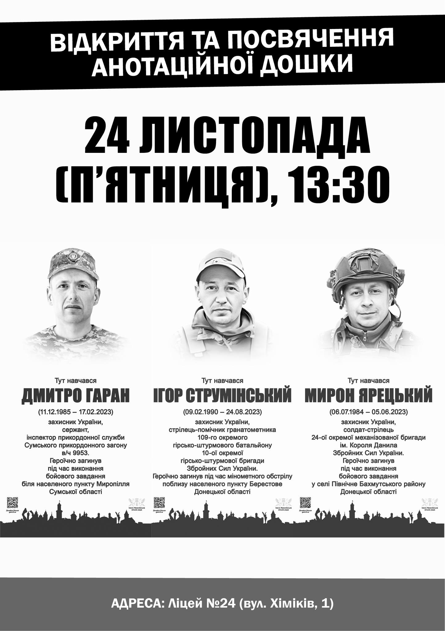 Так, 24 листопада, в п’ятницю, о 13:30 год відкриють три анотаційні дошки полеглим захисникам - Дмитру Гарану, Ігорю Струмінському та Мирону Ярецькому.