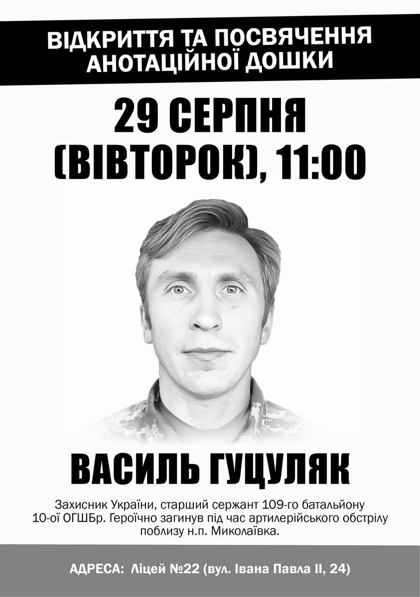 Завтра, 29 серпня, відкриють анотаційну дошку полеглому Герою Василю Гуцуляку.