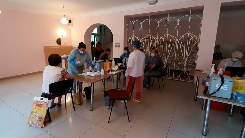 Перед початком вакцинації люди заповнюють анкету, потім спілкуються з лікарями – розповідають їм про свої захворювання та чи мають алергію.