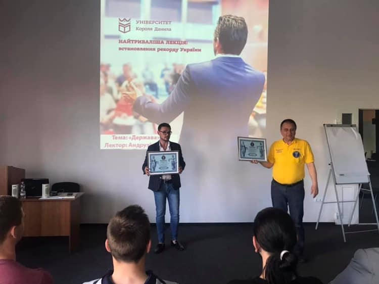 Викладач Олег Андрухів виступає перед студентами з лекцією про українську державність з дев’ятої години вчорашнього ранку.