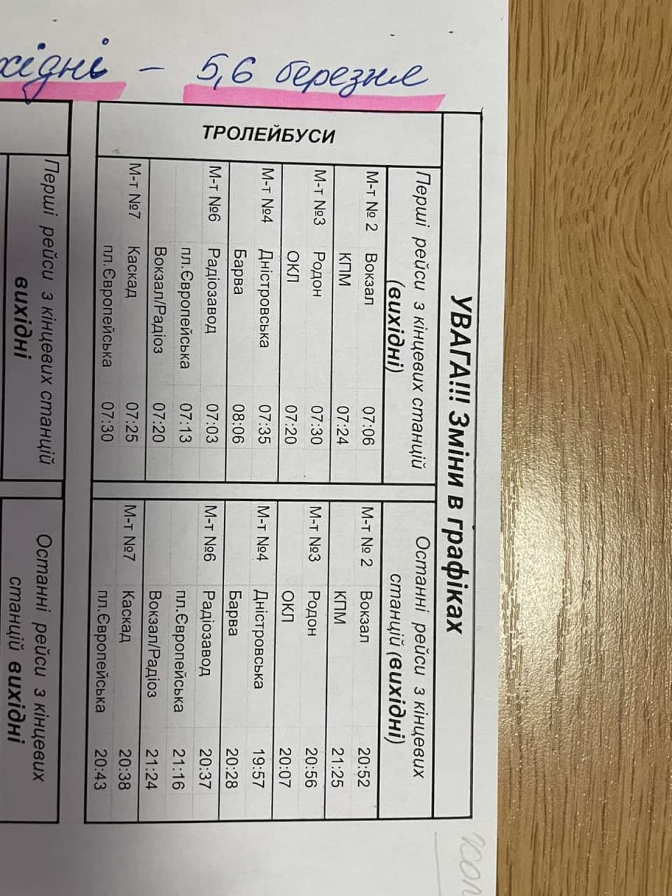 "У зв'язку з введенням комендантської години з 22:00 до 7:00 години ранку у вихідні дні - 5, 6, 7, 8 березня перші та останні рейси комунального транспорту частково будуть відмінені.