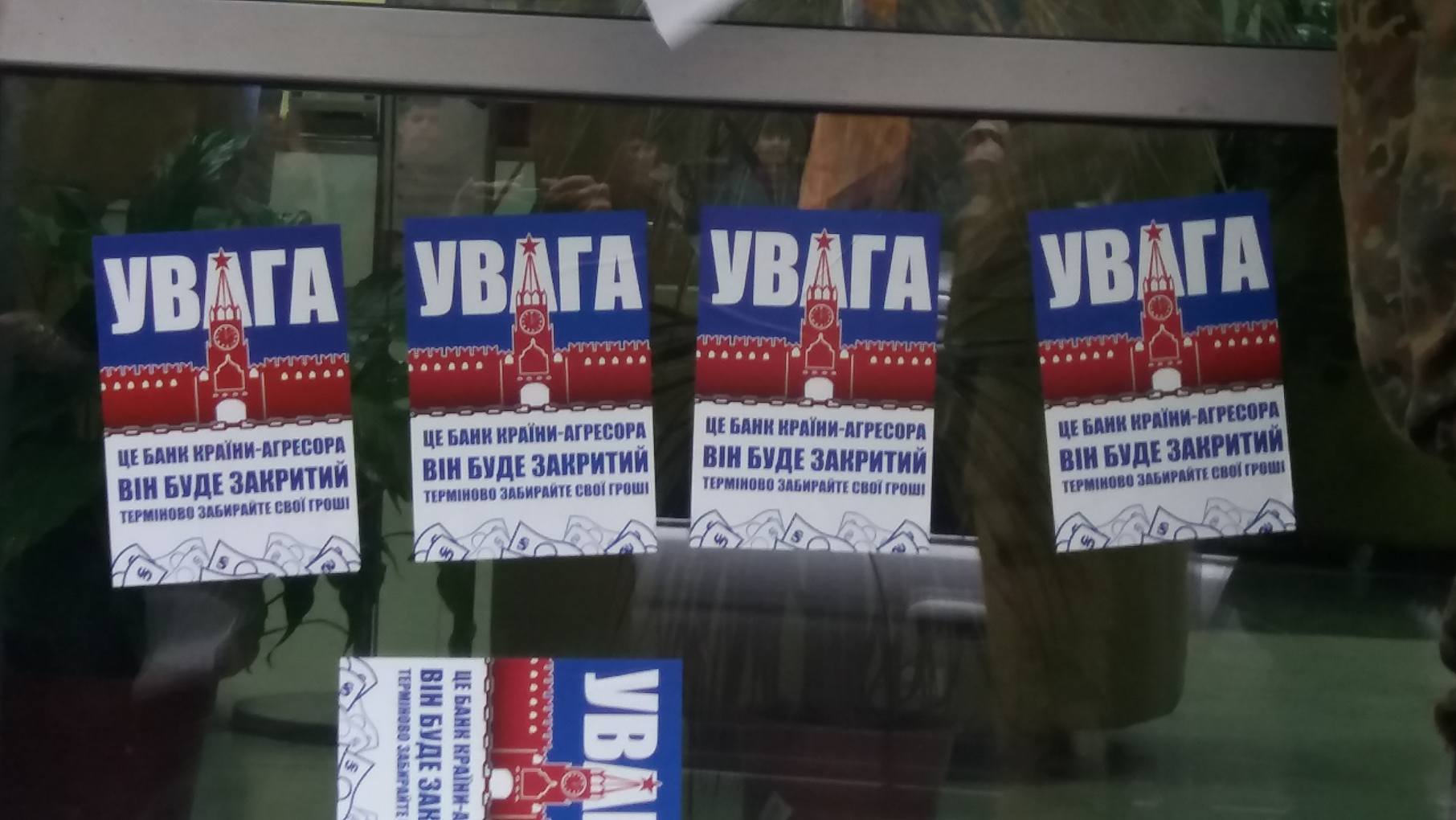 За допомогою наліпок активісти попередили українських вкладників про закриття "Сбербанку" та нагадали, що те саме чекатиме всі ворожі структури, що і досі функціонують в Україні.