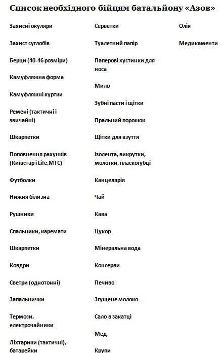 «Я готовувався самостійно забезпечувати власні потреби у батальйоні, тому продуктів харчування і речей поки що вистачає, ─ розповідає він. ─Гроші, які мав ─ дав на потреби батальйону, залишив тільки на дорогу додому. Ситуація у хлопців, які перебувають в батальйоні значно гірша: форма зношена, продукти харчування закінчуються,потрібні засоби гігієни, а з приходом новобранців гостро постала проблема в касках і бронежилетах, також дуже потрібні каліматорні приціли».