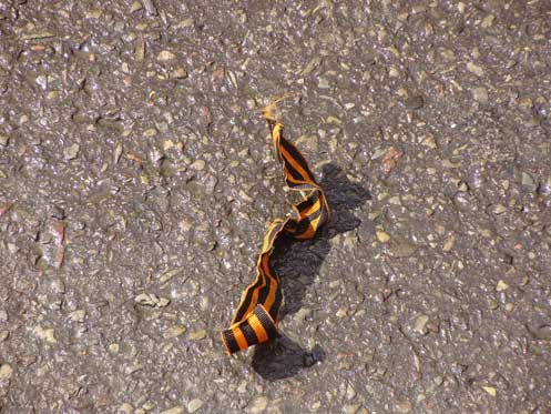 Після завершення панахиди колона "свободівців" маршем пройшлася по вулиці Лепкого, по дорозі зриваючи із перехожих та ветеранів георгіївські стрічки.