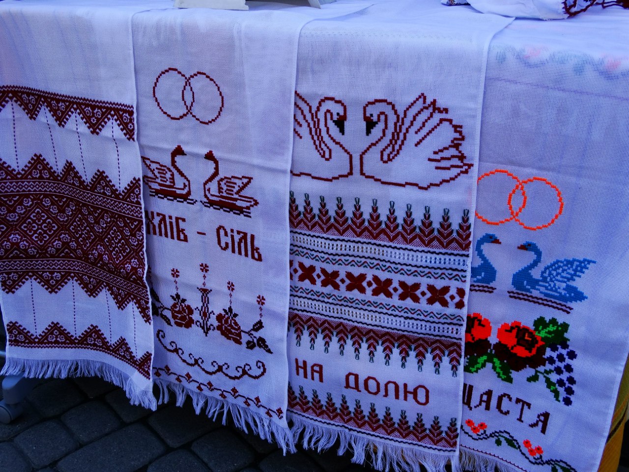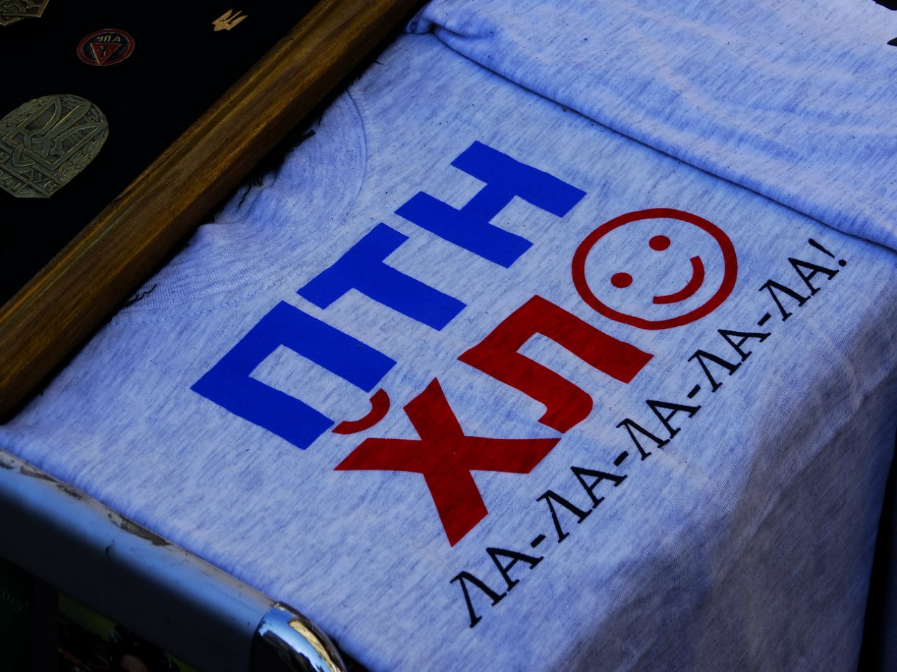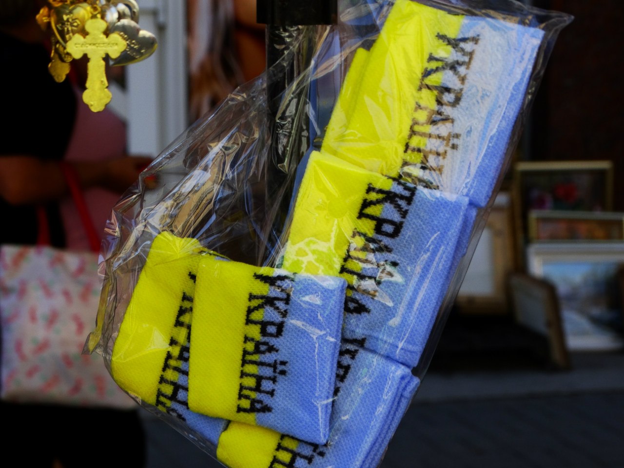 Від самого ранку на пішохідній частині вулиці Незалежності розпочався патріотичний ярмарок. У продажі - стилізовані українським орнаментом шкарпетки, різноманітні керамічні вироби, вишиті сорочки, лялки ручної роботи і звичайно ж уже традиційні футболки із надписами про Путіна.
