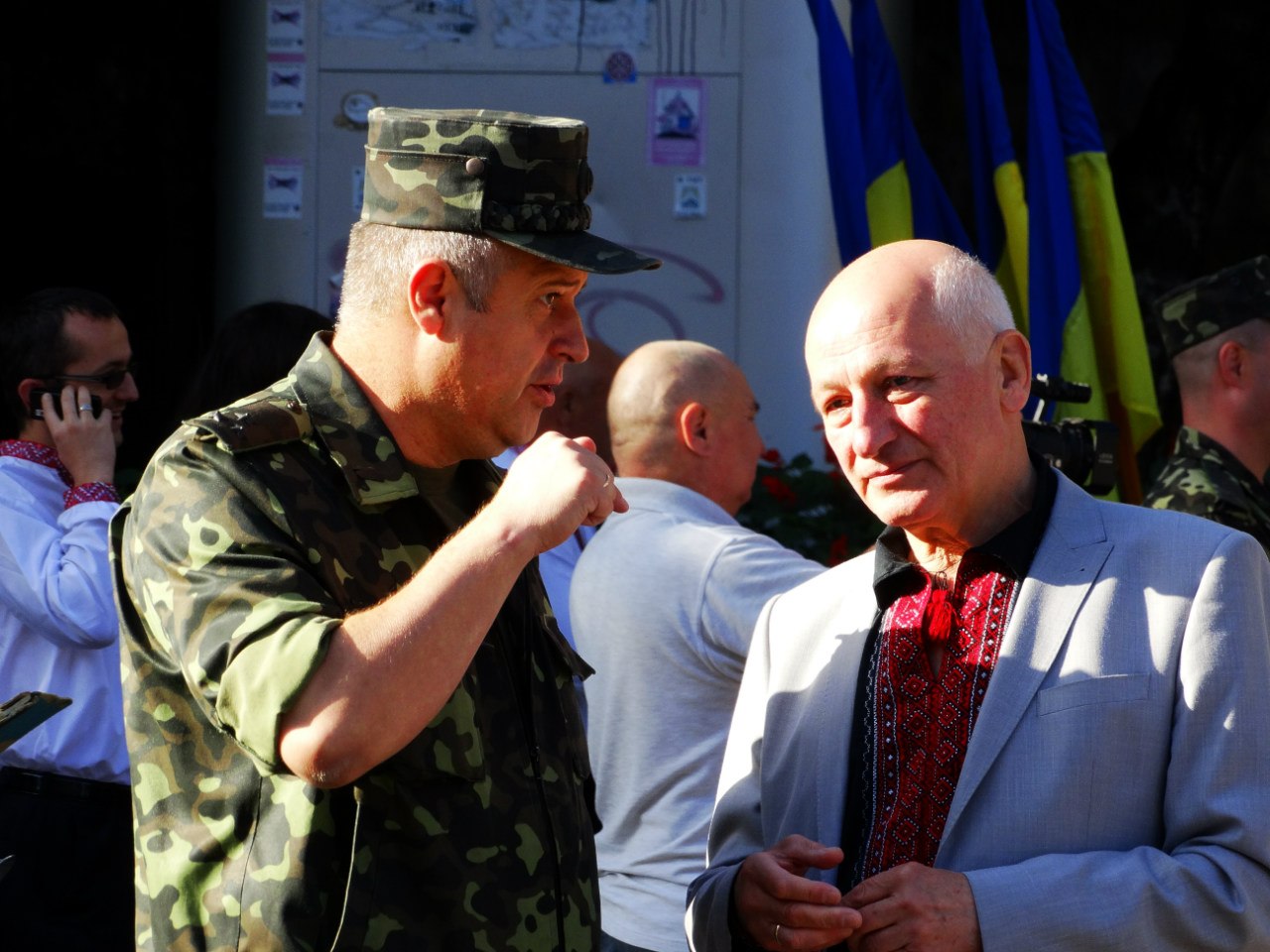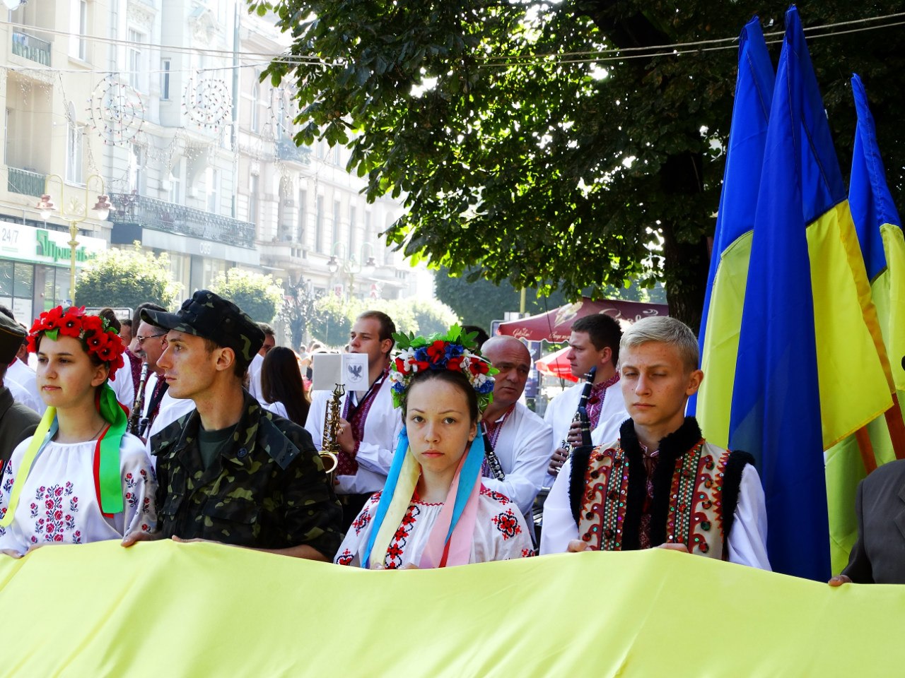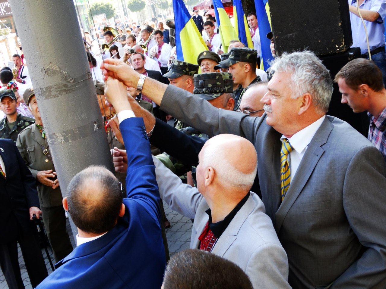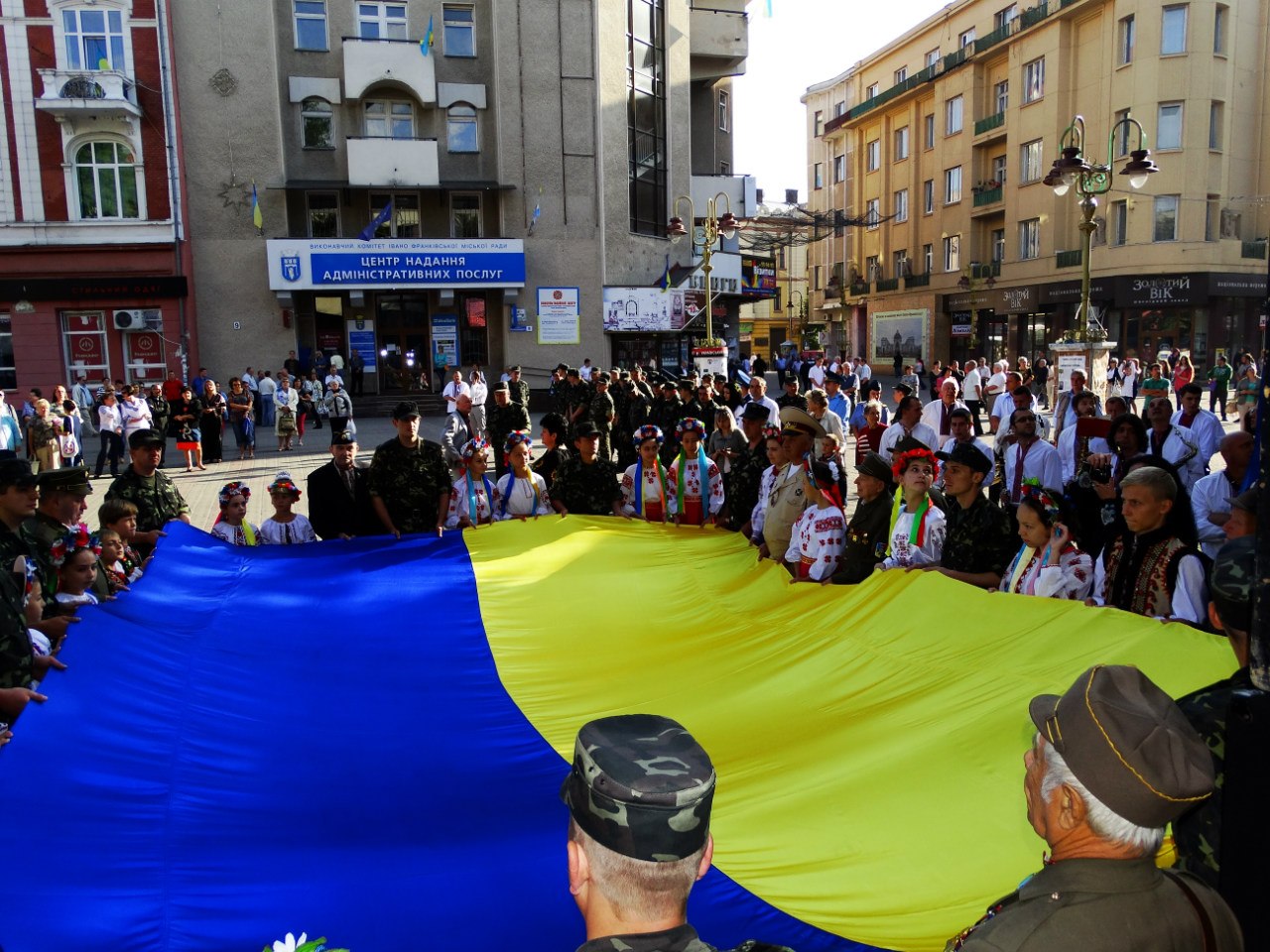 "Український прапор - живий символ відродження українськогонароду, його святиня. Сьогодні українські родини несуть до хреста своїх діток на українських порапорах. Нажаль, саме на них ми прощаємося з героями, що віддали життя за незалежність України", - звернувся до франіквців голова Івано-Франківвської ОДА Андрій Троценко. - Підняті прапори повинні відродити у наших серцях віру, надію і любов. Віру у те, що Україна переможе агресора. Наді на те, що ми швидко відбудуємо національну економіку і як повноправна нація ввійдемо в ЄС. І любов до України - живу і полумяну".