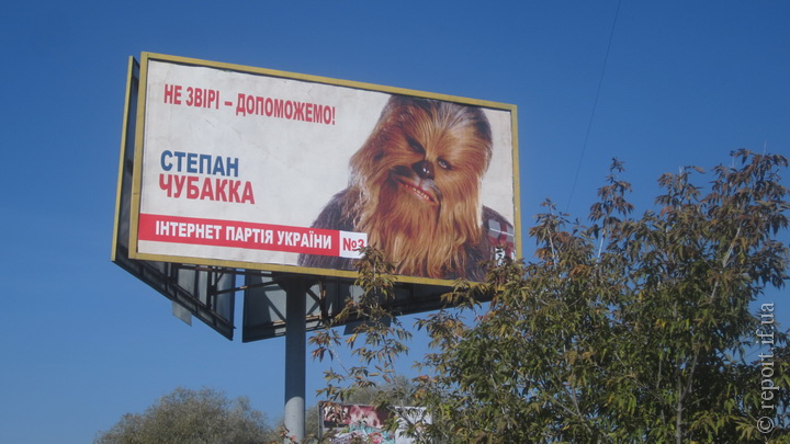 В Івано-Франківську на вулиці Галицькій поруч з’явились два білборди: через дорогу від Юліної “Батьківщини” висить поплічник Дарта Вейдера Степан Чубакка, кандидат від Інтернет партії України, образи яких змальовані з кіносаги “Зоряні війни”.