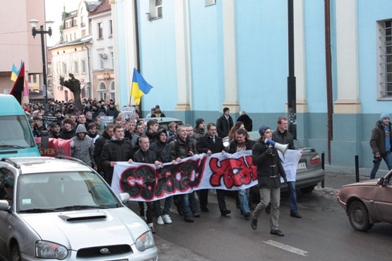 Організована колона із національною символікою, стягами ОУН-УПА та, скандуючи гасла "Волю Павличенкам", "Свободу чесним", "Свободу Павличенкам", пройшлася маршрутом: вулиця Незалежності - Вічевий майдан - Площа Ринок - вулиця Грушевського(адмінбудівля ОДА). Під час руху учасники акції зупинялися, щоб роздати усім перехожим листівки із поясненням "Справи Павличенків".