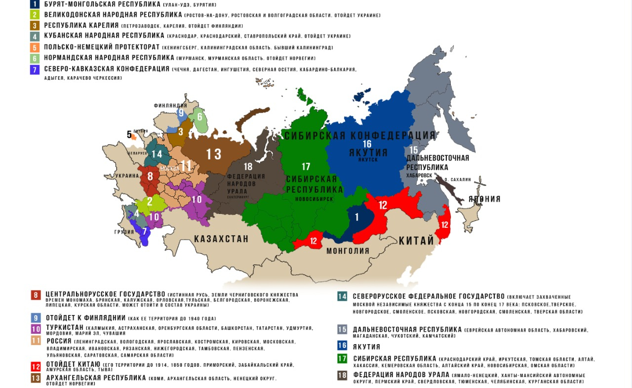 Згідно з даними китайських політологів, на місці сучасної росії утвориться вісімнадцять незалежних держав, а окремі території увійдуть до країн, що оточують рф.
