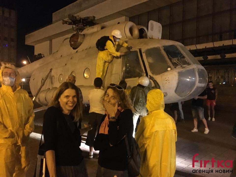 Гелікоптер "покатали" центральними вулицями Івано-Франківська і "припаркували" на площі перед облмуздрамтеатром. Допомагали із перформансом талісмани фестивалю - жовті чоловічки "міньйони".