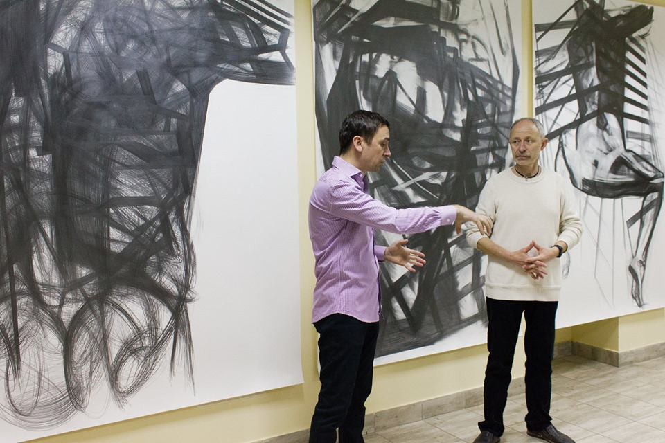 Простір галереї, як зауважують відвідувачі, наче розтискається великими експресивними масами рисунків, двометрові формати листів створюють замкнений простір вражень, втягуючи глядача своєю напруженістю та динамікою.