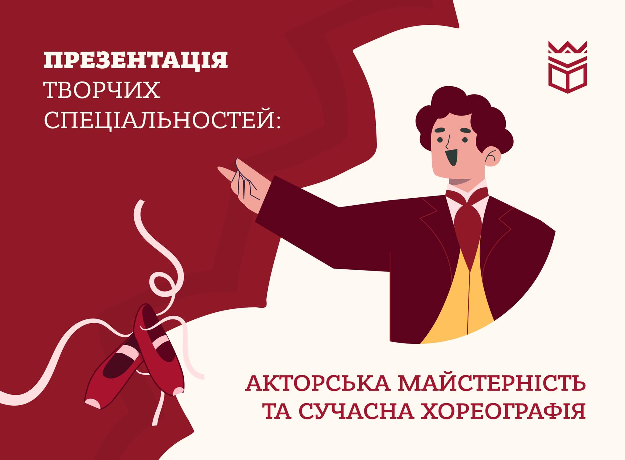Учасники презентації зможуть відвідати постановки фрагментів вистав та скласти пробний творчий конкурс для вступу на спеціальність. А власне творчий конкурс складатиметься з двох частин: - виголошення монологу / байки або декламування вірша; - виконання пісні або танцю.