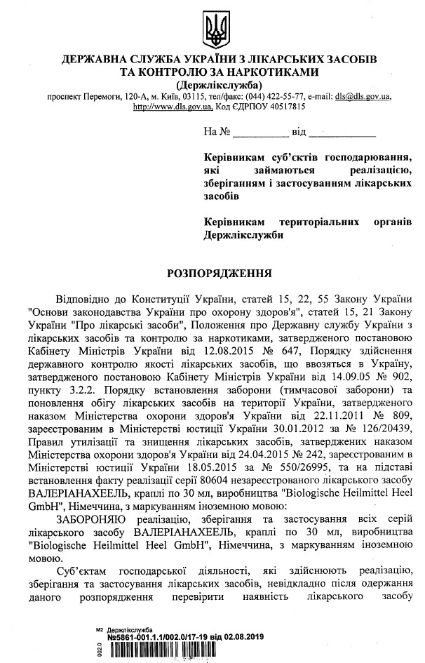 Мова йде про "Валеріанахеель", краплі по 30 мл, виробництва "Biologische Heilmittel Heel GmbH", Німеччина, з маркуванням іноземною мовою. Заборонили всі серії препарату через факт реалізації незареєстрованої в Україні серії 80604 ліків "Валеріанахеель".